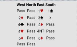 Over vests 2 ruter hoppet øst altså som du ser til 3 spar - Splinter (kortfarge med rutertilpasning). Da ble vest sine kort enda bedre med null og niks i spar, bra sekskorts farge og ett ess. Det er også litt ekstra at det esset er en dobbelton. Så vest kontrollmeldte 4 kløver. Etter to kontrollmeldinger til kom 4NT - Key Card Blackwood - og konklusjonen ble 6 ruter.