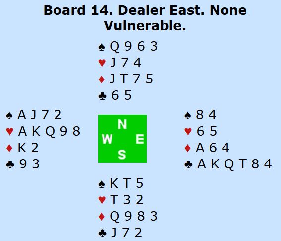 Meldingsforløpet gikk likt ved begge bord. Etter pass fra øst og nord åpnet vest med 1 spar før nord nord meldte inn 2 kløver. Nå sa øst 2NT som var definert som utgangsinvitt med minst firekorts trumfstøtte. Syd passet, og vest hoppet til 4 spar med pass rundt.