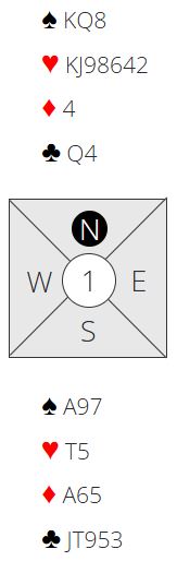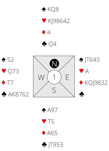 Med Nicolai som vest og Thor Erik øst gikk det pass, pass og 1 hjerter fra øst. Syd meldte inn 1 spar, og med passet hand strakk Nicolai seg til 2 ruter. Hele meldingsforløpet ble slik: