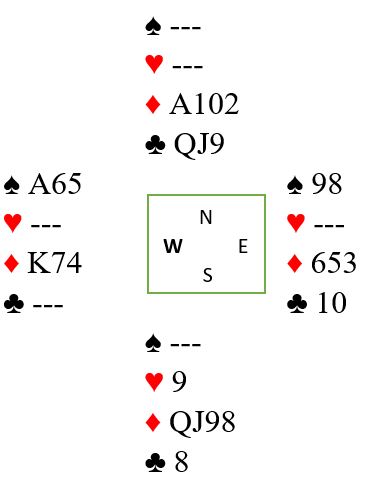 Ved det ene bordet ble spillefører ivrig da han så mønsteret for eliminasjon! Han stakk utspillet og trumfet en kløver med det samme. Så et par runder trumf og nok en kløver til stjeling før det ble spilt hjerter. Nord stakk med esset andre gang og fridde seg med en hjerter. Da måtte det bli bet siden hele spillet så slik ut: