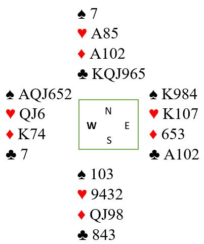 Nå spilles kløver 10. Idet syd ikke kan dekke tieren kastes elegant en ruter. Nord er innspilt og må gi vest for ruter konge, eller spille kløver til dobbel renons som trumfes hos øst med ruteravkast fra vest. Det blir en hjertaper, kun en rutertaper og en kløvertaper (!) – ti stikk. Spilles korrekt er altså vinnervarianten å la N/S få ett kløverstikk i en farge du har singelton mot esset tredje!