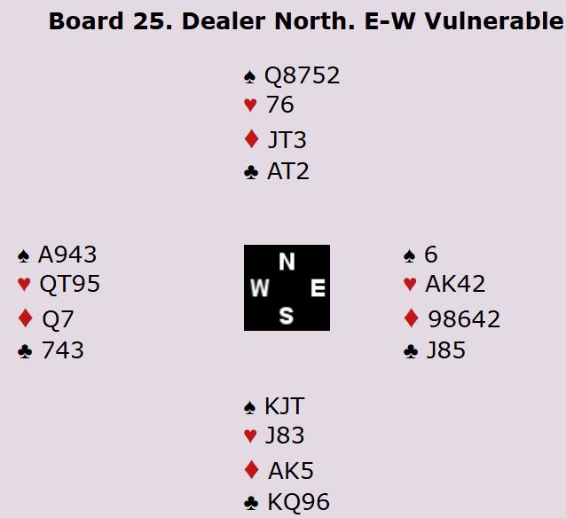 Der Johan Bjørkan og Jørgen L. Nordby (U-21) satt Ø/V meldte det ungarske paret 1NT-2 hjerter overføring, og da syd sa 2 spar passet nord. Det er ikke urimelig, og det meldingsforløpet ble kopiert ved en rekke bord. Men kortene sitter bra sammen som gjør at det er en ganske bra utgang med kun 24 HP til sammen og ikke noe spesiell fordeling. Ø/V har to hjerterstikk og trumfesset. Dermed må minorfargene løses uten taper. Det er to muligheter: enten må kløveren gir fire stikk, eller ruter dame kan sitte i saks. Kløveren forsøkes først av de to vinnersjansene. Da den fargen ordner seg med fire stikk er det ti enkle, en ruter forsvinner hos nord på syds fjerde kløver. Det er dog en fordel av trumfen sitter 3-2, for om den sitter 4-1 kan det bli trøbbel om forsvaret finner hjerterutspill og spiller tre runder hjerter må nord trumfe og ville i så fall hatt samme lengde i trumf som den med for eksempel esset fjerde. Motspillere bør da ligge unna to ganger med esset sitt. Spilles en tredje runde trumf da stikkes med trumfesset fulgt av en fjerde hjerter som fører til at den som eventuelt har fire trumf i mot får ett trumfstikk til for sin fjerde trumf.