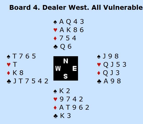 Kontrakten ble 4 hjerter stort sett over alt. Sånn som det sitter er det to rutertapere, to trumftapere og en kløvertaper, altså bør det bli to bet.