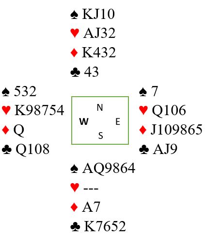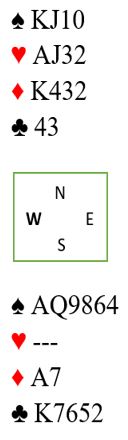 Vest må nok ha spar konge hvis dette skal ordne seg. Inne på hjerter ess må det spilles trumf. Men hvordan bør trumfen behandles? Liten til knekten fulgt av esset er en mulighet, og da kan trumftaper unngås om vest har spar konge dobbel. Men skjer det er det fortsatt mulighet for to tapere, en i hver rødfarge. Men at at det ikke blir rutertaper er det jo en bra sannsynlighet for.