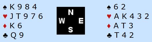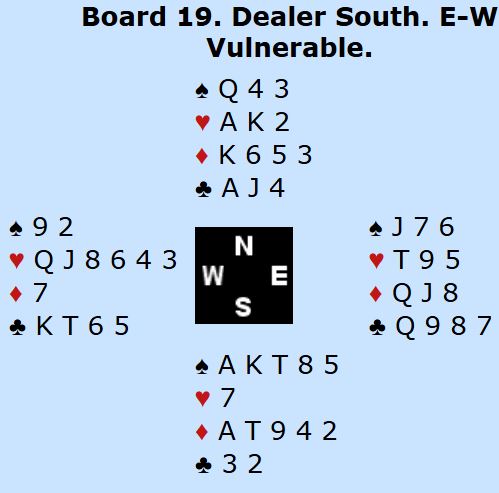 Ved det andre bordet ble det spilt trumf til knekten, over på kløver ess og trumf dame. Da ble det trumftaper siden vest fikk dekket med singel konge i andre trumfrunde, og østs tier voks opp til stikk. Spillefører var fortsatt ikke fortapt og ville vunnet om øst satt med trekorts ruter siden spillefører i så fall ville rukket å bli kvitt syds småhjertere. Spillefører i gang med ruteren, men øst kunne trumfe tredje gang med tieren og innkassere hjerterstikket. En bet, og 17 IMP i sving,