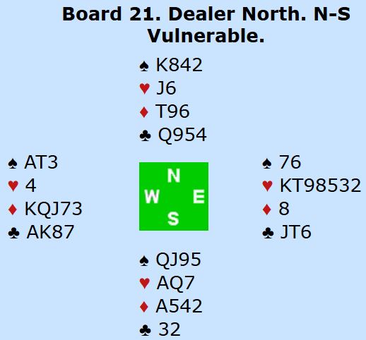 Storeslem i ruter er litt bedre enn 7 spar, for i ruterkontrakt kan det ordne seg selv om sparfargen sitter skjevt. Kløvertaperen forsvinner på den andre hjerterhonnøren. Uansett må ruteren ordne seg for at det skal bli tretten stikk. Det er egentlig ikke så dårlig sjanse. Ruteren kan sitte 2-2, eller idet en honnør legges ned kan det spilles på finesse over den med knekten eller damen tredje. Men selv om dette godt kan ordne seg er sjansen for liten til at det bør meldes storeslem. Det er dog sånn i bridge at det ikke alltid er rettferdig i enkeltspill, og om USA hadde vunnet dette spillet ville det gitt mange sure IMP ut for svenskene. Sånn ble det ikke: