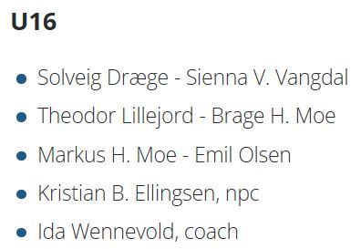 Vi nevnte Heiberg-Evenstad og Græsholt Sjødal som vant kvaliken. De andre er Ida Marie Øberg og Marius Dalemark Austad (nr. 6 i kvaliken), Erleta Plana som spiller med svenske Castor Mann (nr. 7) og Thomas Tøsse som spiller med danske Sohpie Bune (nr. 11).