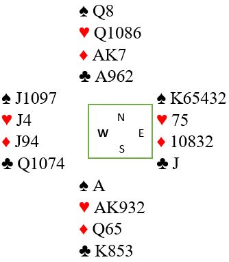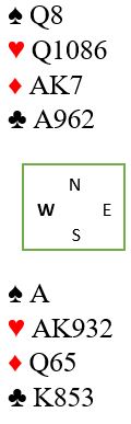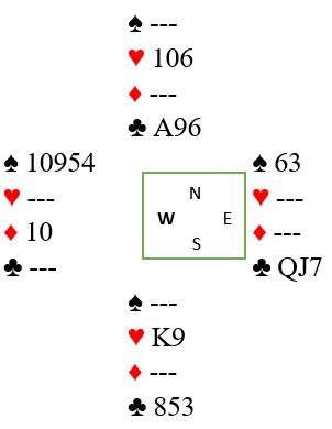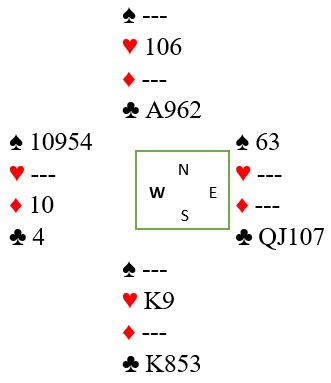 Trumfen viser seg å sitte 1-1. Nord har trolig åtte hjertere, åpningen på fire-trinnet var tross alt i ugunstig sone. Dermed har syd sannsynligvis ruterlengde. Hvis syd har firekorts ruter går det bra å stjele to rutere og få god den femte som en hjerter kan kastes på. Da blir det kun en kløvertaper. Men om ruteren sitter 5-1 går ikke det, i så fall må ruterfinessen tas. Det blir galt bare om nord har damen dobbel eller tredje i ruter.
