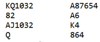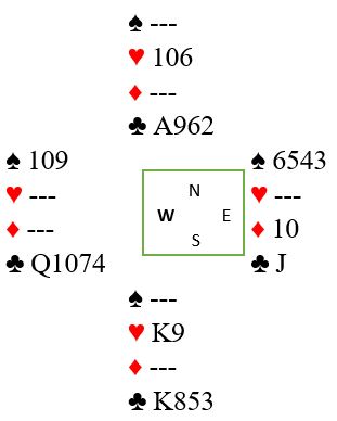 Det kan for eksempel sitte slik at øst startet med Q-J-10-x i kløver fra start. Da blir dette igjen etter eliminasjon av sidefargene er utført: