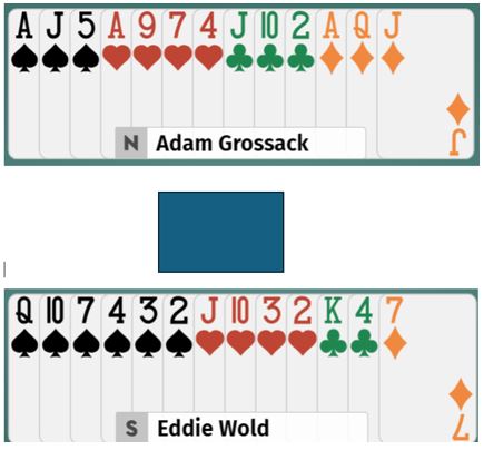 KAPLAN noterte derfor +100 som sammen med +650 ved det andre bordet ga 13 IMP på vei mot å bli USA 1 i VM.