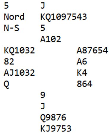 Spar ess vinner første stikk, så et par runder trumf, spar dame trumfes og tre runder ruter spilles (eliminasjon av sidefargene). Nå er det kun dette igjen: