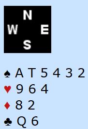 Som øst åpnet jeg med 1 kløver og en kineser på vests plass meldte inn 1 spar som absolutt ikke ville blitt mitt valg i den situasjonen. Makker hoppet til 3 ruter som viste noe sånt som dette, kanskje litt mindre noen ganger. Nå passet nord, kanskje også en tvilsom avgjørelse, det går vel an introdusere hjerterfargen? Jeg ante fred og ingen fare, og så optimistisk (igjen) for meg noe sånt som esset syvende i ruter som ville vært nok til at 3NT ville vært nesten nedlegg. Så 3NT ble budet, og det gikk pass rundt.