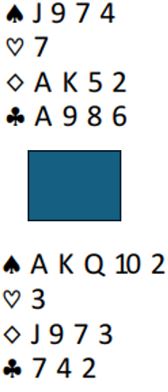 Vest er ferdig. Hvis han kaster en spar til og holder fire hjertere, vil Syd bare dukke en spar. Da han holdt tre hjertere og to spar som overfor, spilte Syd tre ganger hjerter og fikk det siste stikket på sparknekten. Det ga hele 11 IMP til USA2, i det Vest spilte ut kløver Dame mot den samme kontrakten ved det andre bordet. Øst kunne stikke over og godspille kløverfargen, og innkasserte tre bet da han kom inn på ruter Konge. USA vant kampen 35-22.