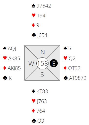 Toppkontrakten er 7 ruter som ble funnet av kun tre par. Å finne den er kanskje mulig om vest får åpnet med 2 kløver og så melder ruter andre gangen. En bra spesialkonvensjon er å spille 2K-2R, så hopp til 3 i majorfarge som minst femkorts ruter + firekorts i den majorfargen 2K-åpneren hopper til. I så fall finnes ruter som trumf og det bør kanskje være en fair sjanse for å finne frem til 7 ruter? Alterrnativet for den sekvensen (2K-2R, 3H) er at åpneren hoppet fastsetter trumfen med en voldsom farge, og meldingen ber om kontrollmelding fra svareren.