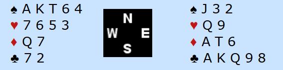 Så langt tenkte nok begge spilleførerne før de satte i gang. Men det gikk likevel litt for fort i første stikk da det begge slapp ruterutspillet til kongen og tok for A-K i trumf (satt 3-2). Så over på spar ess og en tredje runde trumf ble tatt. Men nå gikk det galt siden det satt slik fra start: