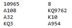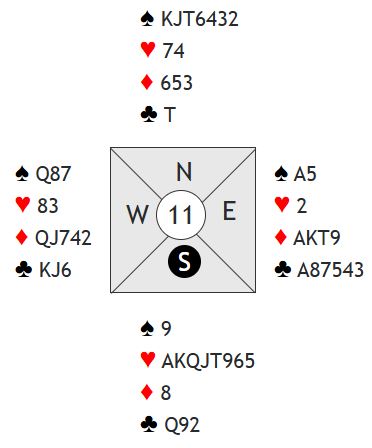Altså, N/S kan vinne kun åtte stikk i hjerterkontrakt. For at det skal skje må motspillerne finne trumfspill så fort som mulig slik at spillefører ikke får trumfet taper(e) på den korte trumfhånden. Det bør vel være mulig å finne trumfskift i andre stikk etter for eksempel ruter dame i utspill. Skiftes til trumf etter ruterutspill får spillefører kun de åtte hjerterstikkene han har på hånden. Om det kommer kløverutspill blir det en stjeling hos nord hvis det skiftes til trumf, totalt ni stikk til spillefører. Om Ø/V ikke skifter til trumf i det hele tatt blir det ti stikk!