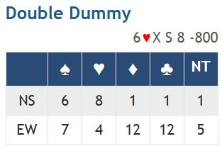 Undertegnede har mange ganger advart litt mot Double Dummy analyser, dvs. computerbaserte analyser som sier hvor mange stikk som kan vinnes i alle tenkelige kontrakter, spilt av hvem som helst og med maksimalt motspill. Det er ikke det at analysene er feil, men det har ofte svært lite med praktisk bridge å gjøre. For å vinne det maksimale mot et motspill som kanskje ikke er mulig i praksis heller, må det ganske ofte spilles helt mot oddsen fordi datamaskinen vet hvor alle kortene er. Single konger toppes enkelt ut osv. Så disse analysene må ikke sees som "det vi burde ha meldt" "eller hvordan kontrakten burde ha blitt spilt". Analysene kan likevel være interessante, men mer som et puslespill for å finne ut hvordan maks antall stikk kan vinnes, eller hvordan motspillet må være for å holde kontrakten på minmimum.