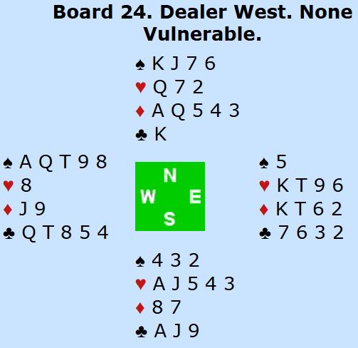 Bakke-Grude (SHOURIE) spilte 3NT som N/S og gikk tre udoblede bet. Det er egentlig en godt resultat på dette spillet, men de tapte 11 IMP. Ved det andre bordet spilte N/S 5 kløver og fikk tretten stikk etter hjerterutspill.