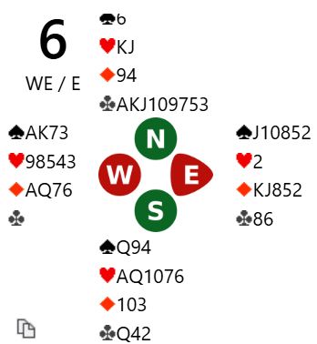 I en av kampene lag MAVERICKS vant klart ble det på spill 6 en merkelig score ved det ene bordet og mange forskjellige/merkelige resultat rundt omkring i salen. Du kan prøve deg med nord sine kort med vest som giver:
