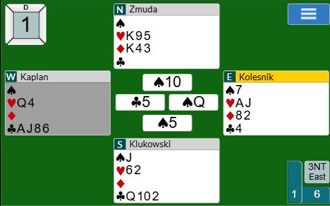 Også mot han gikk det ruter 10 ut til knekt og dame fra nord, men Kolesnik stakk med det samme. Så kløver 9 som fikk løpe til kongen. Nå skiftet nord til hjerter, et litt merkelig valg, kanskje. Det er jo tre sikre hjerterstikk uansett her, men hjerterskfitet ble faktisk litt hjelpsomt for spillefører slik det utviklet seg videre. Hjerterskiftet fra nord fikk gå til tieren, så ruter opp mot gjenværende 9-8-2. Nord måtte legge liten, for stikker han med kongen får øst to ruterstikk. Ruter 9 vant det stikket, og amerikaneren tok for A-K-Q i spar. Da så det slik ut: