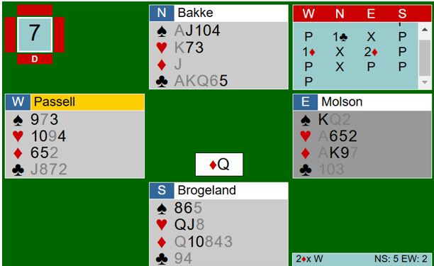 Meldingene gikk på samme måte ved begge bord i kampen USA-Europa, og Bakke-Brogeland skulle spille mot 2 ruter doblet. Det er fire toppstikk i den kontrakten, men det kan fort bli ett stikk til om ikke motspillet sitter. Så det bør blir +800 eller +1100 til N/S.