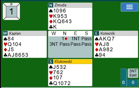 Kolesnik viste god «card-reading» i dette spillet selv om han fikk bitte litt hjelp av motspilleren på nords plass. Ved begge bord ble kontrakten 3NT av øst etter at nord hadde åpnet med 1 ruter. Begge på syds plass spilte naturlig nok ut ruter 10 som ikke akkurat var noen trussel for spillefører. Det gikk ruter 10, knekten fra bordet og damen fra nord. Hvis øst stikker med esset har nieren og åtteren vokst opp til de nest største kortene i fargen! Donati som spilte 3NT for Europa lasjerte imidlertid. Nord visste ikke om syd hadde ruter 9 eller ikke, så han fortsatte med ruter til østs nier som beholdt stikket. Så kløver 9 som fikk seile rundt til nords konge. Derfra kom spar 10 som øst stakk, så kløver til finesse som holdt idet nord kastet en ruter. Donati dro hjerter dame som stod rundt før han tok med seg kløver ess fulgt av nok en hjerterfinesse. Da ble det tre sparstikk, tre hjerterstikk, to ruterstikk og to kløverstikk, ett overstikk og +430 som egentlig et greit resultat. Men Kolesnik gjorde det litt bedre.