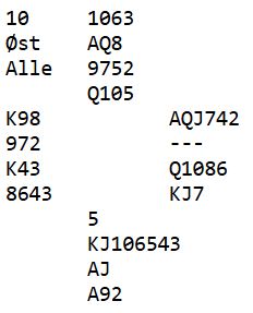 Selv om vest har absolutt minimum for sin høyning til 2 spar står det i 4 spar med 19 HP til sammen! Ruteren ordner seg med kun en taper, og da handler det om å greie seg bare to kløvertapere. Esset eller damen foran er nok til at det går bra ved å spille kløver fra vest mot K-J to ganger. Med litt forsiktig spilleføring bør det bli ti stikk. To par fikk spille den kontrakten. Ett av dem gikk bet, mens det andre paret som var i 4 spar noterte den høyeste scoren som Ø/V da de ble doblet og fikk ti stikk, +790.