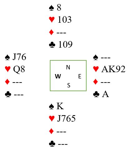 La oss si nord spiller ut kløver. Spillefører gir bort ett ruterstikk og har altså 11 sikre. Kanskje skifter de til spar til damen og esset. Så tas ruterstikkene fulgt av resten av kløveren. Før den siste kløveren fra øst ser det slik ut: