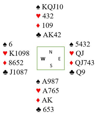 Spillefører gir altså bort ett hjerterstikk med liten fra begge hender. Så kommer han inn igjen, og da kan det ventes med sparhonnnørene, men det går også an å ta A-K i spar for oversiktens skyld (og da kan du claime 12 stikk om dame knekt faktisk sitter dobbel). En sparhonnør fra nord kommer på i andre sparrunde. Så tas tre runder kløver fulgt av ruterstikkene. Før den siste ruteren innkasseres ser det etter denne utviklingen slik ut: