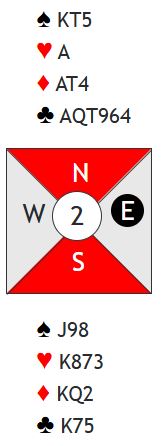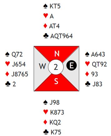 Syd åpner - for de fleste med 1 kløver - og da blir naturlig nok nord sleminteressert. En start kan være 1 kløver - 2 kløver som omvendt minor. Da viser syd balansert 12-14 NT, så det er ikke helt opplagt å melde slem. Det er de samme stikkene i grand og kløverkontrakt. Merk at kløveren er sikker for seks stikk ved å starte med en honnør fra nord. Sitter fargen 2-2 eller 3-1 spiller ikke det noen rolle, men pga. at de rår over 10-9 kan 4-0 løses samme hvem som har fire. På honnør fra nord oppdages sitsen om det sitter sånn, og finessen tas over den som eventuelt har fire. Dermed er det 0+2+3+6 = 11 sikre stikk. Det finnes ingen annen mulighet for det tolvte enn i spar. Der har spillefører mellomkortene, og det kan enten spilles på damen eller esset hos vest.