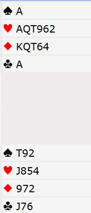 Litt av en hånd! Her skal det svært lite til før det er slem i kortene, men det kan jo hende makker har null og nada i rødfargene, og i så fall blir det ikke så bra. Men i utgang skal vi i alle fall,