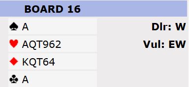 Det er klart 6 hjerter ville vært bra om syd hadde hatt trumfkongen, eller ruter ess. Og det ville vært en brukbar sjanse også uten trumfkongen hvis syd hadde inntak, kanskje ruter knekt eller en dobbelton ruter. Joda, det blir litt sånn hvisomatte osv for å unnskylde det dårlige spillet...men man ville smilt og vært fornøyde om trumfkongen hadde kommet deisende under esset. Her var det bare å notere en bet. Det var ikke mange som hadde den scoren, så spillet ga oss fattige 3%.