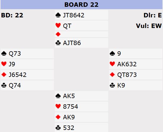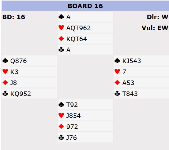Av 21 bord var det bare 8 bord som var i slem. Per Egil og Jørgen gikk ut med et smell, og meldte som eneste par 7 hjerter. 4kløver viste singlteton/renons og gode kort. Da Per Egil bekreftet 2 ess og renons i kløver var Jørgen sikker på at det måtte være spill for 7 hjerter. Slik kortene satt var det 13 enkle stikk.