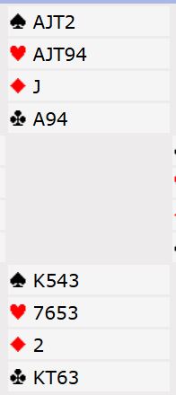 Makker (syd) åpnet med 3 ruter, og jeg sa naturlig nok 3NT. Øst følte seg robbet og doblet før det gikk pass rundt. Etter spar ut til kongen var det elleve sikre stikk, og det tolvte - det tredje doblede overstikket (!) - kom for sikkerhets skyld da øst kastet en hjerter idet alle ruterstikkene ble innkassert. Uten at vi hadde gjort noe som helst verken godt eller dårlig ble det altså N/S +1350 - en solid redusering av ledelsen deres. Og dette føltes nok ganske ille for øst, noe som kanskje påvirket "avgjørelsen" hans i motspillet i det neste spillet, og for meg som spillefører: