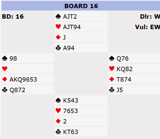 Randi Marie Olsen - Jan H. Olsen fra BK Mix Tromsø var det eneste paret som noterte +2140 for 7 ruter med tretten stikk. Ett par fikk tretten stikk i 6 ruter (nest topp). Ca. 30% av N/S-parene fikk tolv stikk i 6 ruter, og de andre N/S-parene var i 3NT med elleve stikk.