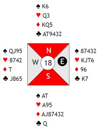 Det kom ruter ut til vests konge. Derfra kom spar 9 i skift til knekten damen og kongen. Det var jo fint, intet sparvalg lenger, men det var fortsatt en spartaper om vests nier var en singelton. Trumf mot hånden avslørte den trumfsitsen som var sannsynlig, øst satt med to sikre trumfstikk med konge-dame fjerde. Vest kastet en ruter. Trumftieren ble lagt, og øst kom inn på damen. Da kom kløver knekt fra øst.