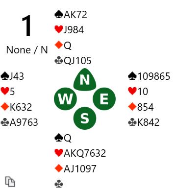Bakke-Grude meldte 7 hjerter og noterte +1510. Motstanderlagets N/S stoppet i lilleslem, så spillet ga 11 IMP til SHOURIE. Seks av de 20 N/S-parene fant frem til denne fine storeslemmen.