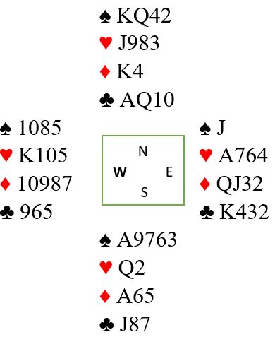 Om vest stikker hjerterknekten med det samme og spiller god sparen er det fortsatt et hjertervalg om ikke det hjerter esset var en singelton. Det oppdages i så fall med liten til damen som vest ikke følger farge på, så hjerterfinesse med nieren er en markert finesse. Om vest følger med liten hjerter andre gangen er det fortsatt et valg. Men nå er det en stor forskjell du kan dra nytte av. Hjerter dame er inntak til nord, men det inntaket kan du vente litt med. Du spiller fire runder ruter først for å se om det gir noe informasjon om fordelingen. Og det gjør det om det sitter for eksempel slik: