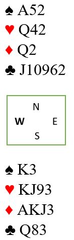 Det kan fort bli tre hjerterstikk om det satses på den fargen, men det blir ikke tre hjerterstikk sånn uten videre. Det må kanskje gjettes om det skal tas finesse med hjerter 9 i tredje hjerterrunde. Men det er klart at å satse på hjerteren i stedet for kløveren kan føre til hjemgang i 3NT.