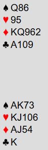 Ruter dame kom i utspill ved de fleste bordene. Spillefører får etter hvert trumfet sin tredje ruter hos vest. Det er jo tre toppstikk i kløver siden damen faller under kongen (eller esset), og nord blir med riktig timing utsatt for en skvis. Forskjellige sluttposisjoner kan oppstå, og det kan spesielt interesserte pusle litt med selv. For eksempel kan vi se på en mulig sluttposs uten at spillefører har gjort noe annet enn å trumfe den nevnte ruteren med trumf hos øst, og tatt ut trumfen. I det diagrammet her har også spillefører tatt for kløver konge, og dette blir igjen: