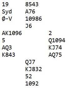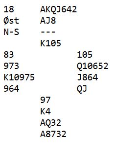Kun seks av 30 lag fant frem til 6 hjerter som er en glimrende slem. Motparten har kun ett kløverstikk. Om det ikke kommer kløver ut er det bare å ta ut trumfen, for selv om det skulle vise seg å være kun tre ruterstikk er det tolv sikre. I dette tilfellet blir det tretten stikk om ikke N/S får med seg kløverstikket. Noen få par stoppet i delkontrakt (!), og hvordan/hvorfor det skjedde ønsker jeg ikke gjette på. Resten var i utgang.
