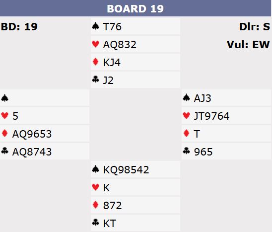 Ved det bordet ble også kontrakten 5 kløver doblet. Men der kom spar konge i utspill til esset, og vest hjerter 5 forsvant. Så ble ruteren godspilt med to stjelinger, trumffinessen tatt undervesi, og det ble ikke stikk i det hele tatt til N/S, 5 kløver doblet med to overstikk gir +1150! Det var imidlertid langt i fra "room top" det heller! Ett par spitle 6 kløver doblet og vant alle stikkene, +1740. Ved to bord ble resultatet +1370 for 6 kløver med tretten. Og i tillegg til våre lagkamerater var det tre par til som noterte seg for +1150 for to doblede overstikk i 5 kløver.