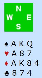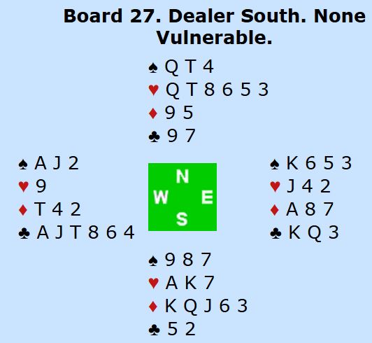 (På spill 27 var det 14 lag av 32 som fikk hjem 3NT. Det var et noen delkontrakter, og resten av Ø/V-parene gikk bet i 3NT etter hjerter ess i utspill.)