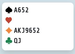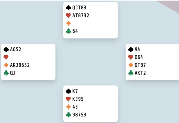 Nå spørs det om du melder noe mer med vests kort eller velger å spille motspill mot 6 hjerter? N/S har meldt 6 hjerter i ugunstig, så det kan være et helt crazy spill hvor det er enormt mange stikk i begge retninger. Nords 2 ruter viste begge major (Michaels). Makker har altså meldt 6 ruter over deres 5 hjerter, men syd ga seg ikke og sier 6 hjerter. Hva tenker du om dette, og hva melder du?