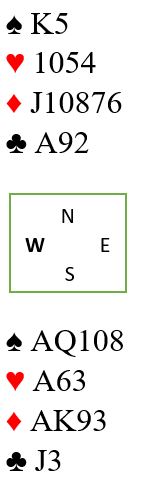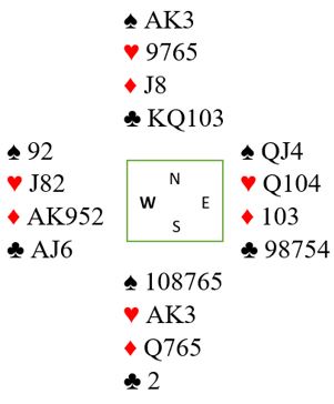 Isolert sett bør en sånn ruterfarge toppes. Det skal dog ikke mye til før det er riktig å legge ned en honnør før man går over til den andre siden for å ta finessen. Det kan være bra spilt hvis man har tro på at den som en eventuelt tar finessen gjennom har lengde i den fargen som skal løses. Her har vest femkorts hjerter mens øst har kun to. Det med «ledige plasser» tilsier derfor at øst er litt favoritt til å ha lengde i ruter. Men du vet ingen ting om lengden i de andre fargene, og dessuten er det en meget god grunn til å slå fra seg den fristende, men risikable ruterfinessen. For kontrakten er bombesikker med kun fire ruterstikk hvis vest som nå har tre godspilte hjerterstikk ikke får komme inn. Derfor bestemmer du deg for å denge ned de to ruterhonnørene. Hvis vest har maks tokorts ruter er utgangen sikker. Om øst har damen tredje må du i så fall gi bort ett stikk i ruter, men vest får ikke komme inn. Etterpå er det ni sikre, og fortsatt mulighet for overstikk.