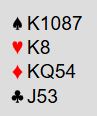 Det ble sparutspill ved det bordet, ikke unaturlig. Før du får se hele spillet kan du vurdere situasjonen ved det andre bordet hvor Terje Aa satt syd. Der ble det også åpnet med 1 kløver. Terje sa pass, og vest sa 1 hjerter før øst viste sin 11-14 NT med 1NT. Terje doblet nå, greit nok synes jeg selv om det nok er minimum for å aksjonere. Og man blir jo litt nervøs et lite sekund idet vest redobler som viser sterke kort! Men N/S var ikke ute på glattisen, nord meldte 2 ruter før det gikk pass, pass og 3 ruter fra vest som var spørsmål om ruterstopper. Da sa øst 3NT. Nå var det mye mer aktuelt å spille ut ruter enn ved det andre bordet. Og Terje spilte ut ruter konge. Slik så hele spillet ut: