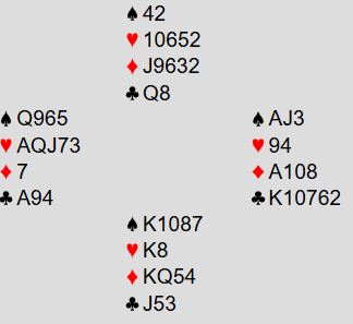 Vi tar med et spill fra en 4.rundekamp hvor et sterkt lag fra Heimdal BK vant sin kamp mot Alta. Det var en kamp man kunne forvente ville bli ganske jevn. men det ble den ikke. Heimdalingene avanserte til 6.runde uten problemer. Og det startet dårlig for Alta allerede i første spill. Ta syds kort og vurder hva som bør gjøres: