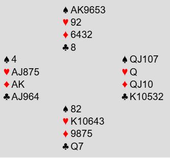 Med kløveren 2-1 var spilleføringen i 6 kløver en formalitet. Nord får ett sparstikk. En hjerter kan kastes fra vests hånd på ruter, og tre hjertere kan etter å ha tatt ut trumfen i to runder trumfes (dvs. resten står på kryss-stjeling).
