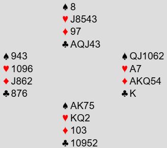 Ved det andre bordet meldte Schaltz for ROSENTHAL 2 spar i samme situasjon, Michaels Cuebid. Øst sa 3 ruter, og Willenken (syd) spratt i 4 hjerter. Den kontrakten kan faktisk vinnes, men da må kløver konge toppes ut. Vest for VEDANTA ville imidlertid også være med selv om det var en blodfattig hånd han hadde. Han sa 4 spar! De er jo i gunstig, og vest har fått vite om en slags dobbeltilpasning i spar og ruter. Så det kan være 4 spar er en god stam. Da 4 spar kom tilbake til syd doblet han og spilte ut hjerter konge. Øst kom inn og spilte stor spar som syd stakk. Så ble øst kortet i trumf, og da syd ble sluppet inn en gang til ble øst kortet enda en gang og mistet kontrollen. Det endte med at syd fikk fire trumfstikk som sammen med ett i hjerter og kløver ess ga tre doblede bet, ROSENTHAL +500.