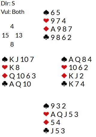 Her er et typisk parturneringsspill fra SILODOR PAIRS i St Louis, en turnering som tidligere nevnt ble vunnet av Nicolai Heiberg-Evenstad sammen med svenske Alexander Sandin. Seieren ble fulgt godt opp av Martin Andresen og Thor Erik Hoftaniska som ble nr. 2!
